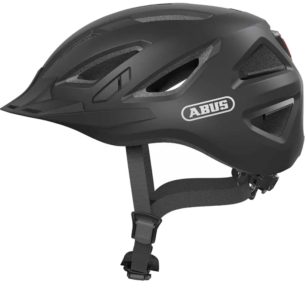 Abus Urban-I 3.0 Helmet Small Velvet BlackThe Abus Urban-I 3.0 Helmet is engineered for the streets and will keep you illuminated wherever your adventure takes you with reflectors and a large integrated rear LED taillight. There is a foamed-in fly net, is compatible with long hair, and Zoom Ace Urban dial with Full-ring for a comfortable fit. This helmet has 12 air inlets and 5 air outlets for cooling ventilation. The Fidlock magnetic strap buckle snaps into place and there is a front visor. The sizing is Small for 51-55cm, Medium for 52-58cm, Large for 56-61cm, and X-Large for 61-65cm. Available in Velvet Black, Signal Yellow, Titan, and Polar White.A5876745