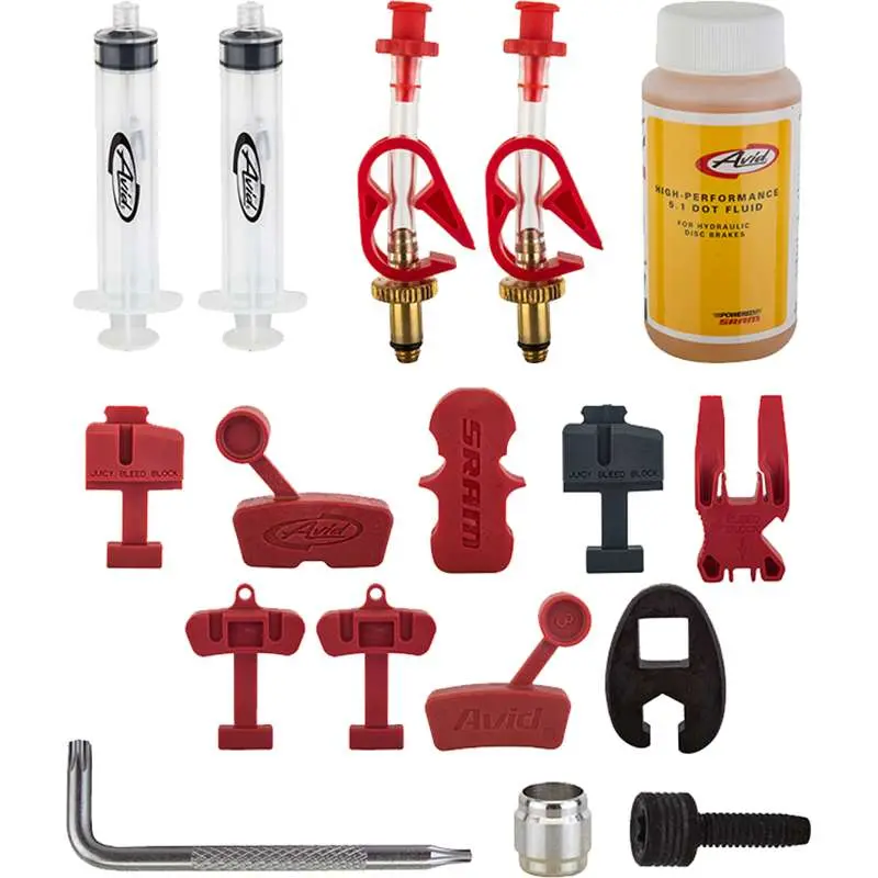 Avid Hydraulic Disc Bleed Kit DOT 5.1 The Sram/Avid hydraulic brake bleed kit is exactly what you need to get the job done. Includes all instruments necessary for bleeding Avid disc brakes, which means it is compatible with Code, XX, XO, Elixir, and Juicy systems. Comes with Standard Syringe x2, Hose Clamp x2, Hose Barb Threaded x2, Hose Fitting x2, Torx Wrench T25 and T10, Bleed Blocks x4, Crow’s Foot Wrench, and one 4oz bottle of DOT 5.1 fluid. 710845610066