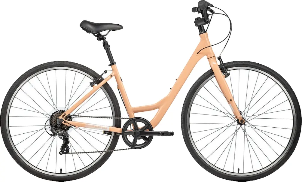 Batch Lifestyle Step Through Comfort 700c Small Gloss Dusty RoseThe Batch Lifestyle Step Through Comfort 700c is a great first bike to explore the neighborhood and light trails. The double walled 700c wheels are built to last and you’ve got 7 gears to flip through to overcome all the hills your adventure has. Shimano Components for smooth shifting and braking. These 700x40c tires have tread that isn’t super aggressive, so it would be excellent both on roads and off roads with minimal resistance from the knobs.811950037318
