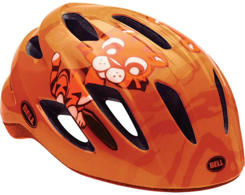 Bell Zipper Universal Child Helmet Orange Tiger The Zipper Youth Helmet is designed with incredible graphics to excite your young rider. The Fusion Polycarbonate Shell is engineered to protect your child during his/her learning experience on the bike. The PinchGuard Buckle helps give your child confidence while eliminating the chance to pinch their fingers while attaching the buckle. The ErgoDial Fit System is just like the adult version to allow your child experience the same adjustment system that you have enjoyed for years. There are 15 large vents to keep your child from overheating. Fits heads 47-54cm around. Weighs only 271 grams. Available in White/Glacier Blue Robo Gogo, Kryptonite Turtle Futbol, Orange Tiger, Blue Puffer, and Pink Paradise. 768686605536