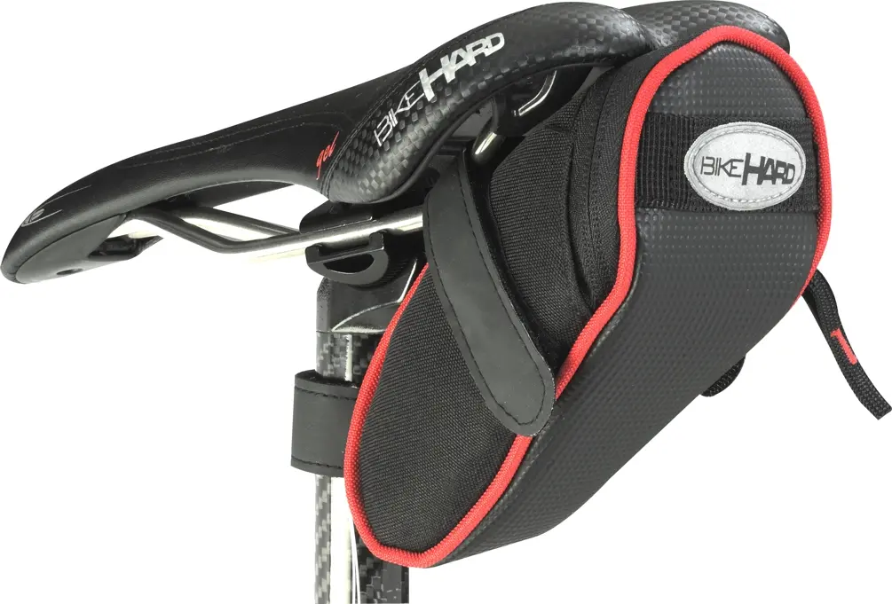 BikeHard Aero Road Seat Bag Black/RedBikeHard Aero Road Seat Bag designed with hidden zipper for a more water tight closure. Aero design to just fit under a racing seat. Long enough for most essentials. Extra tough 600x600D Polyester material with PVC coating keep your contents dry and safe. Scotchlite piping for Reflective safety. The zippers are enclosed for a neat look and a water tight fit. Velcro seat rail straps are designed for easy mounting on any seat. Available in Black/Black, Black/Red, Black/Blue.850228007233