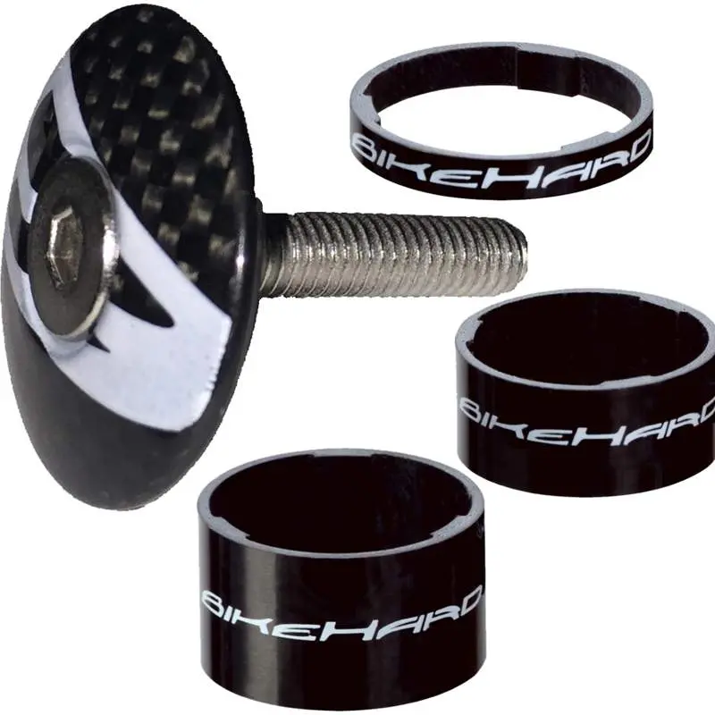 BikeHard Carbon Spacers and Top Cap Set 1 1/8" Full CarbonThe BikeHard Spacer Kit and Top Cap set consists of three carbon unidirectional carbon spacers (5mm, 10mm, and 20mm) and a fully carbon top cap. The spacers are internally ribbed and relieved to decrease weight while maintaining the strength necessary to stabilize the structural integrity of your cockpit. The top cap is completely constructed from carbon fiber as well, with a aesthetically pleasing conical top shape and a completely recessed matching bolt. Not including the bolt, 35mm of standard alloy spacers and an alloy top cap weighs in at 35 grams. This kit carbon kit weighs in at an astonishingly low 16 grams. There is no other component upgrade that will as easily and economically halve the weight on a bicycle.817616022186