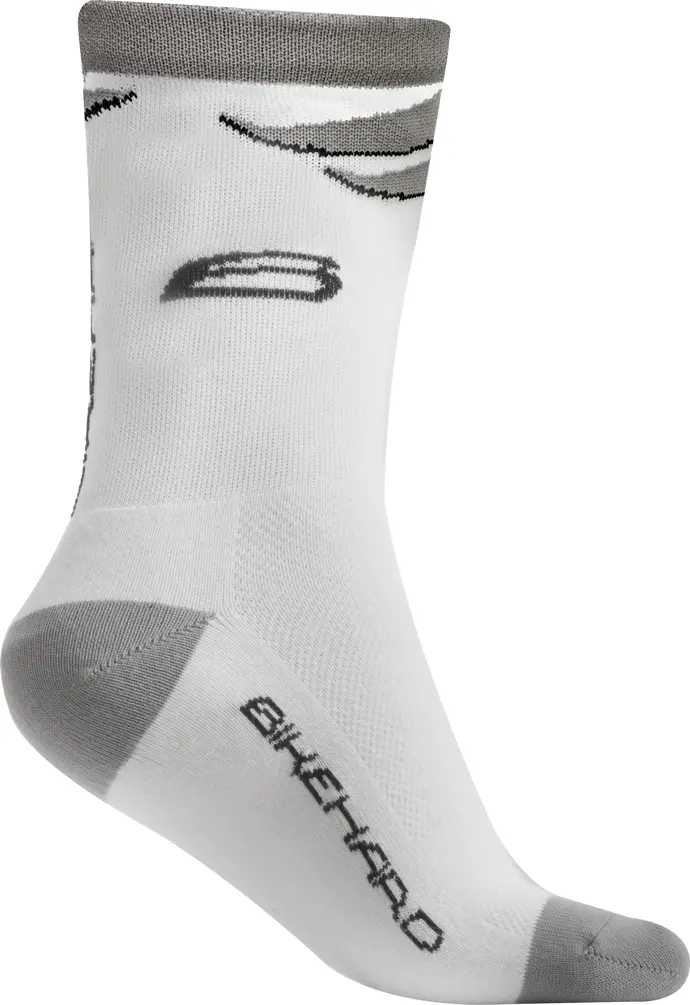BikeHard Challenger Mid Cycling Sock S/M White/Grey BikeHard Challenger Mid Cycling Sock is made in the USA from the highest quality Aireator CoolMax fabric. Designed to fit your foot comfortably and wick perspiration and moisture away from the foot and into the sock. Ultra durable 5" team-cut cuff lasts for season after season of the toughest conditions you can throw at it. 850228007486