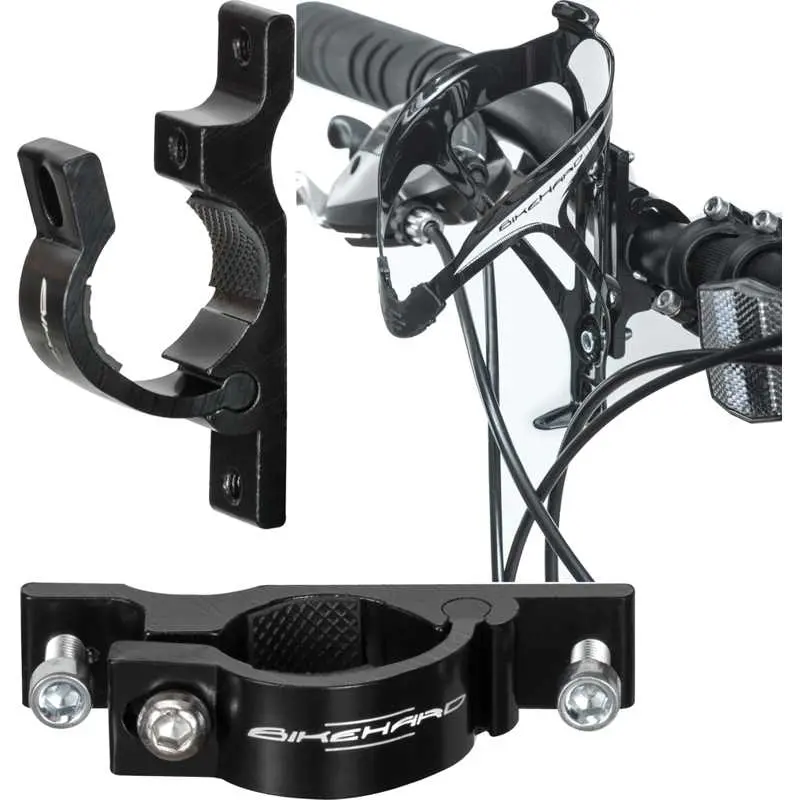 Bikehard Handlebar Bottle Cage Adapter MountThe BikeHard handlebar adaptor mount is an ingenious little alloy clamp that provides the same mounting bolt spacing as would be found on the inner triangle of a bicycle frame. With a single bolt, this bracket can be attached onto any handlebar, at any angle, and is primarily designed to accept water bottle cages. However, an infinite amount of accessories can be mounted, since the bolt spacing is an industry standard 64mm. Relieved internally to accept rubber grippers, this little clamp can hold firmly in place even with a full water bottle. Comes with all necessary hardware. Purchase for one Adaptor Mount.817616022261