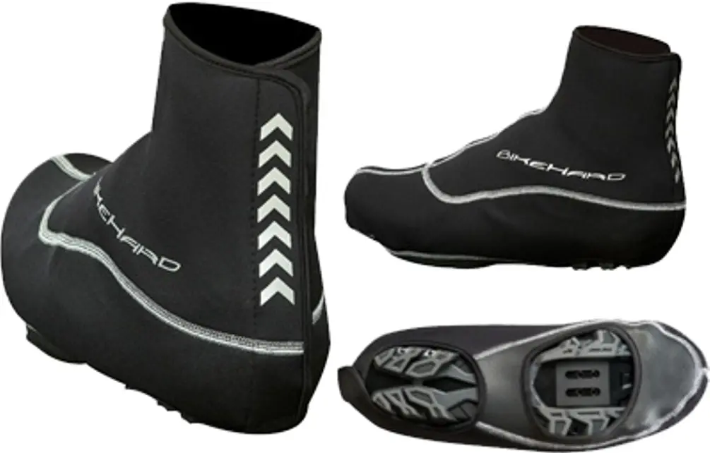 BikeHard Outline Pro Shoe Cover Small The BikeHard Outline Pro Shoe Cover features full 5mm-thick neoprene coverage along the entire upper foot, with hook and loop fastening at the rear for easy installation and removal. Heavily reinforced rubber sole for long-lasting durability and an extremely ergonomic pre-curved construction to prevent gaps and maximize insulation. Fits any road, mountain, or cycling shoe with any cleat combination. Reflective chevrons on the rear complete this as a safe, comfortable, and super warm shoe cover. 817616021219