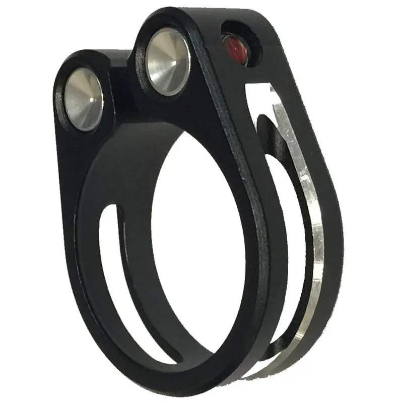BikeHard Seatpost Clamp 31.8mmThe BikeHard Outline seatpost clamp is a machine crafted and ingeniously designed bicycle component. Starting off as a small piece of 6066 aluminum, it is forged, CNC machined to a 14mm height, and then anodized black. Once more it finds its way into the CNC machine to remove unnecessary weight and increase aesthetic appeal. To ensure the strength of the clamp, the affixing method is 2 alloy inserts threaded together with a stainless steel bolt. The result is a ridiculously lightweight piece, only 18g, and forged from a hardened alloy will last the test of strain on the trails, road race, or daily commute. Black with silver accent in color.850228007912