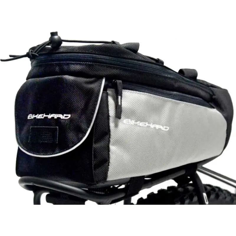 BikeHard Urbanite Trunk BagThe BikeHard Urbanite Trunk Bag is an insulated rack mounted bag designed to house all traveling essentials. Constructed from the same exceptionally high 600 denier count used on all Bikehard bags, the fully insulated main compartment can house items 12 inches long, by 6 inches wide, by 5 ½ inches tall (at its tallest point). Since the bag tapers as it gets closer to the saddle, when mounted on smaller bicycles, clearance is rarely an issue. There are zippered pockets on each side, a Velcro closed pocked on the rear, an adjustable webbing on the top, and a full-length stuff pocket on the inside of the top. Secured by two Velcro staps on the underside to the rack, this top bag has the option of carrying relatively few items or when packed out can hold more than 450ci of storage. Finished off with tasteful embroidery, reflective elements and a rear light strap mount, the Urbanite trunk bag is as fashionable as it is convenient.817616023183