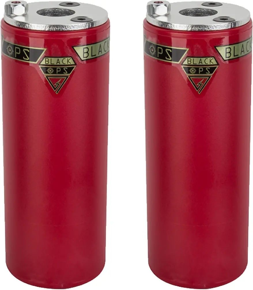 Black-Ops Axle Pegs 3/8 and 14mm Red The Black-Ops Axle Pegs are made of super hardened nylon construction. These pegs have a diameter of 40mm and a length of 100mm. There are special inserts that are compatible with both 3/8’’ and 14mm axles. These pegs as a set weigh 90g. Available in White, Red, Orange, Green, Blue, and Black. 72774968145