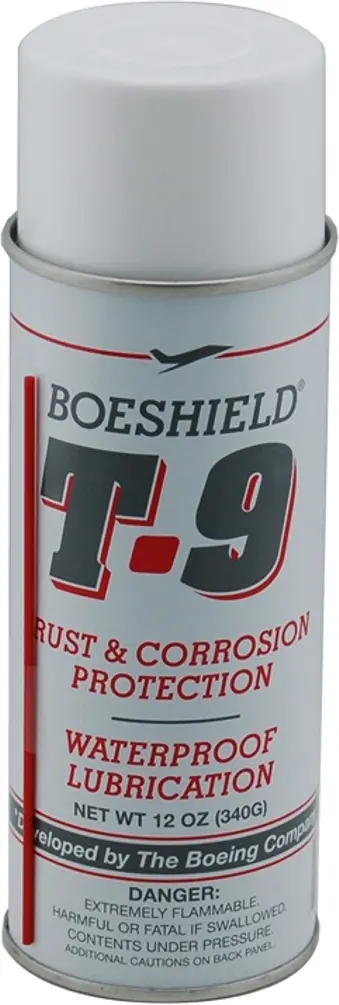 Boeshield T-9 Waterproof Lubricant 12oz SprayBoeshield T-9 Waterproof Lubricant. Spray on and wipe off. Develeped with the Boeing Aircraft Corporation, Boeshield T-9 Waterproof Lubricant will dissolve itself and flush out any other lubricant. Penetrates deeply to thoroughly coat inner pins and rollers. Dries to a clean Paraffin Wax film so it will not pick up dirt. Lubricates and protects for 150 to 200 miles per application.738481900129