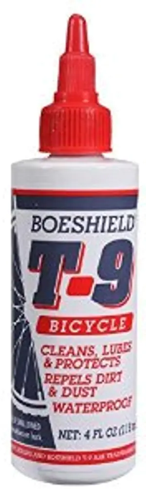 Boeshield T-9 Waterproof Lubricant 4oz DripBoeshield T-9 Waterproof Lubricant. Spray on and wipe off. Develeped with the Boeing Aircraft Corporation, Boeshield T-9 Waterproof Lubricant will dissolve itself and flush out any other lubricant. Penetrates deeply to thoroughly coat inner pins and rollers. Dries to a clean Paraffin Wax film so it will not pick up dirt. Lubricates and protects for 150 to 200 miles per application.738481901041