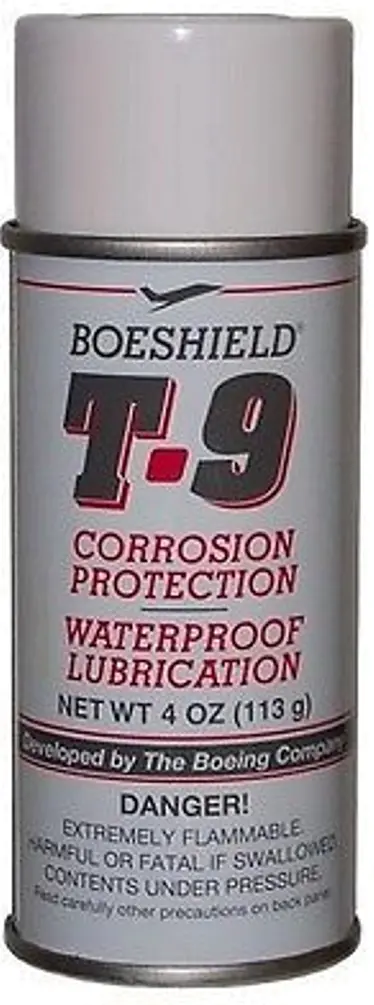 Boeshield T-9 Waterproof Lubricant 4oz SprayBoeshield T-9 Waterproof Lubricant. Spray on and wipe off. Develeped with the Boeing Aircraft Corporation, Boeshield T-9 Waterproof Lubricant will dissolve itself and flush out any other lubricant. Penetrates deeply to thoroughly coat inner pins and rollers. Dries to a clean Paraffin Wax film so it will not pick up dirt. Lubricates and protects for 150 to 200 miles per application.738481900044