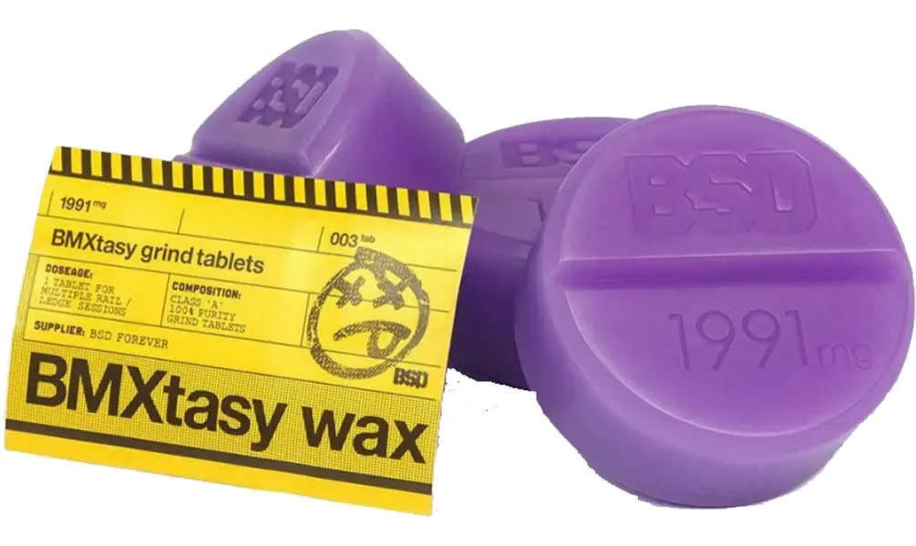 BSD BMXtasy Grind Wax 3 Piece Purple The BSD BMXtasy Grind Wax 3 Piece comes with 3 Class ‘A’ 100% purity grind tablets. One tablet can be used on multiple sessions. Engineered to reduce friction while grinding. Available in Orange and Purple. 5060792162190
