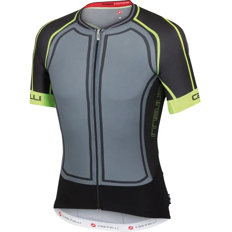 Castelli Aero Race 5.0 Jersey FZ X-Large Turbulence/Black/Yellow FluoThe Castelli Aero Race 5.0 Jersey FZ is one of highest quality, fastest jerseys to face the sport of cycling. The Velocity Dry on the front and 3D Fabric on back and sleeves bring this jersey to the pro level. There is a compression band around the waist to hold the 3 rear pockets in place. The arms are mesh, there is a full length YKK Camlock Zipper for ultimate ventilation. There are reflective tabs to increase your visibility when you spend long hours training. Close out item, limited quantity.8055688072377