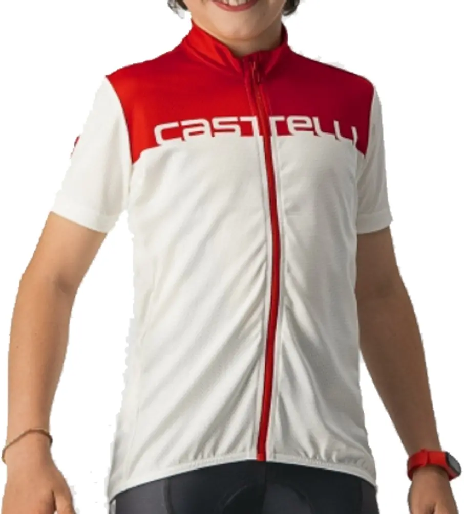 Castelli Neo Prologo Jersey 8Y Ivory/RedThe Castelli Neo Prologo Jersey uses Microfiber 100% polyester fabric for a comfortable young rider. The YKK Vislon full-length zipper gives maximum ventilation when they need it. The Sillicone at the waist helps to prevent ride up. The Sublimation-printed graphic looks amazing. These jerseys weight about 127g. Perfect for 16°C - 38°C / 61°F - 100°F. Available in Red/Pro Red, Ivory/Red, and Electric Lime/Savile Blue.8050949615416
