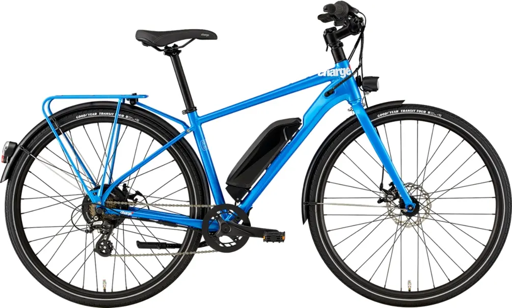 Charge City High Step E-Bike Large Team BlueThe Charge City High Step E-Bike is engineered for commuting and being stored easily with foldable components. The Bafang Hub Drive Motor can bring you up to 50 miles on a single charge and there are 5 pedal assistance settings as well as a thumb throttle so you can decide how much effort you want to give on your commute. The 7 speed 14-34t setup gives you plenty of shifting options as you navigate the hills and winding roads on your adventure. The cable actuated disc brakes give you powerful and sensitive stopping power when you need it. The double wall rims are paired with Goodyear Transit Tour 700 x 40 puncture resistant with reflective sidewalls for durability and resilience. The top speed is 20 mph and coming fully equipped with a full-length fender set and rear rack for storage and placements for lights for enhanced safety. The pedals and stem + handlebar folds to the side easily to make storage quick and versatile. There are integrated, high powered front and rear lights for day and nighttime visibility. There are automatic tire pressure sensors to let you know when you could use more air immediately before you go to ride. Available in Electric Blue and Silver.038675210264