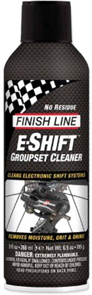 Finish Line E-Shift Groupset Cleaner 9ozFinish Line E-Shift Groupset Cleaner is a degreaser designed specifically for use with electronic groupsets. Due to its unique formulation, E-Shift™ Groupset Cleaner can quickly and safely remove grit, grime, and moisture from any electronic groupset. With E-Shift™ there is no need to worry about damaging wires or derailleurs. With a state of the art formulation, E-Shift™ quickly evaporates without leaving a residue behind, which means there is no need for water rinsing. Parts are left completely clean and dry in minutes.036121710153