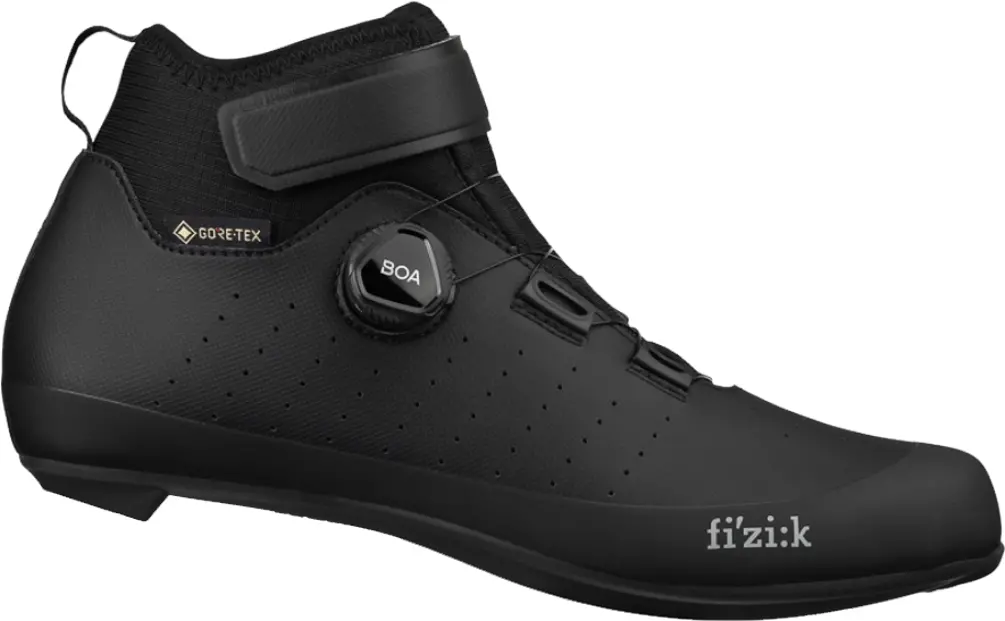 Fizik Tempo Artica R5 GTX Shoe 42.5 Black The Fizik Tempo Artica R5 GTX Shoe is engineered as a road cycling winter shoe, featuring an advanced GORE-TEX membrane and insulated fleece lining to be extra warm, breathable, and waterproof. The featured insulated GORE-TEX Koala membrane makes it fully waterproof, meaning you can rely on proven performance to keep you dry when it matters most. Beyond simply stopping wet weather, the advanced GORE-TEX technology is optimized for better breathability. To fight against frozen toes and keep feet toasty, the Artica GTX features a brushed-fleece lining. The effect is twofold, adding a soft layer that encompasses the feet in extra comfort while providing added warmth for triple-digit rides in single-digit temperatures. The upper Velcro closure is easy to adjust quickly, while the single L6 BOA® dial, gives micro adjustments on the fly for ultimate comfort. The newly redesigned R5 nylon outsole has a stiffness index of 6, offers moderate stiffness for efficient pedaling. Additionally, the cleat position is set slightly further back compared to traditional settings to better optimize pedaling efficiency and reduce knee compression. On this winter-specific configuration, the outsole omits vented holes to keep feet warm and dry. Weighing in at 319g. Available in Black. F3035425