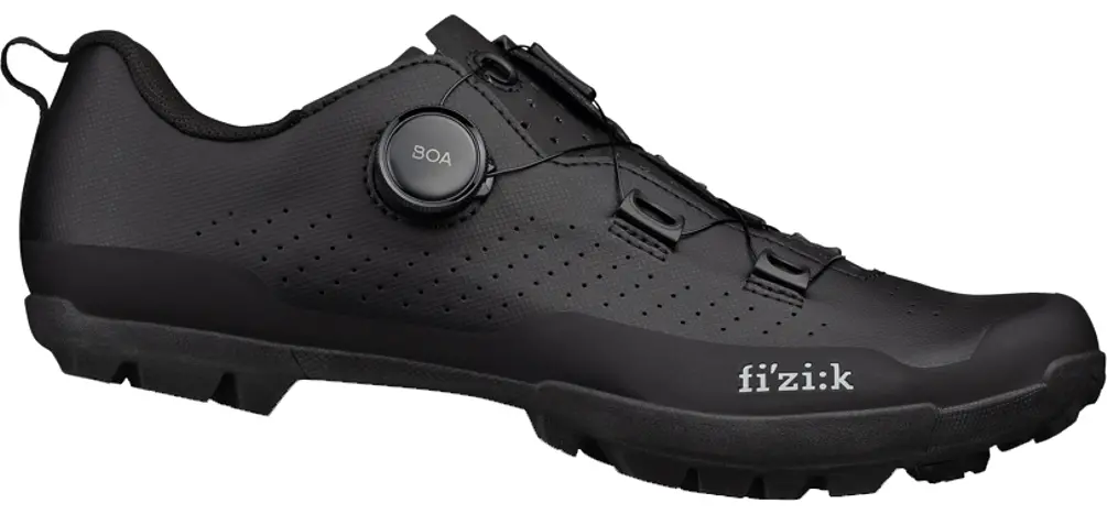 Fizik Terra Atlas Shoe 43.5 Black/Black The Fizik Terra Atlas Shoe is a true all-terrain, all-road cycling shoe designed with a more generous fit for endless comfort, from gravel tracks to MTB trails, all-day adventures to extended bike packing escapes, for riders who know no borders. This shoe is engineered to efficiently spin pedals off-road, equally capable of handling fast and fun down country laps, epic all-mountain rides, long-distance backcountry adventures and drop bar gravel grinding. These shoes are well-ventilated without sacrificing protection thanks to a TPU overlay that reinforces the toecap. Easily adjusted with a practical, single-BOA closure to dial in your fit and go wherever the day may lead. Fizik redesigned the X5 outsole for better grip and more traction. Equipped with generous studs and a rubber coating that covers the entire surface, including the mid-foot, the X5 outsole provides sure footing when steep, rough tracks require you to hike your bike. There is a hidden nylon foot plate is there to deliver balanced stiffness for pedaling efficiency. SPD Compatible. Available in Black/Black, Grey/Black, Pink Grape, and Army. F3028435