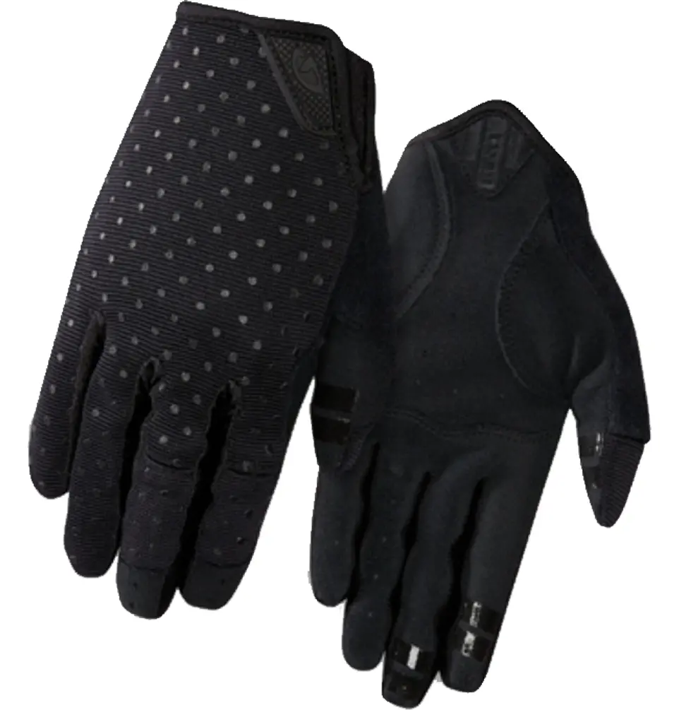 Giro Women’s La DND Glove Large Black DotsThe Giro Women’s LA DND Glove is all about getting down and dirty on your ride. The Super Fit Palm has a three-panel design and Flex Zones at knuckles gives your hand the range of motion you need while shifting and braking. The Ax-Suede Synthetic Leather Palm is durable and gives you good grip. The palm is made from 92% Polyester and 8% Spandex. The fingertips are reinforced for super longevity. The upper is moisture wicking, breathable, and flexible. The Upper consists of 70% Nylon, 20% Polyester, and 10% Cotton. The 2mm EVA Crash Pad distributes impact energy to help protect your hands in the event of the unexpected tumble. Silicone finger tips increase your grip. The Thumb and Index fingers can be used with touchscreen devices. Available in Black Dots, Checkered/Peach, Dark Shadow/White Dots, and Midnight Blue/Cool Breeze.768686682162
