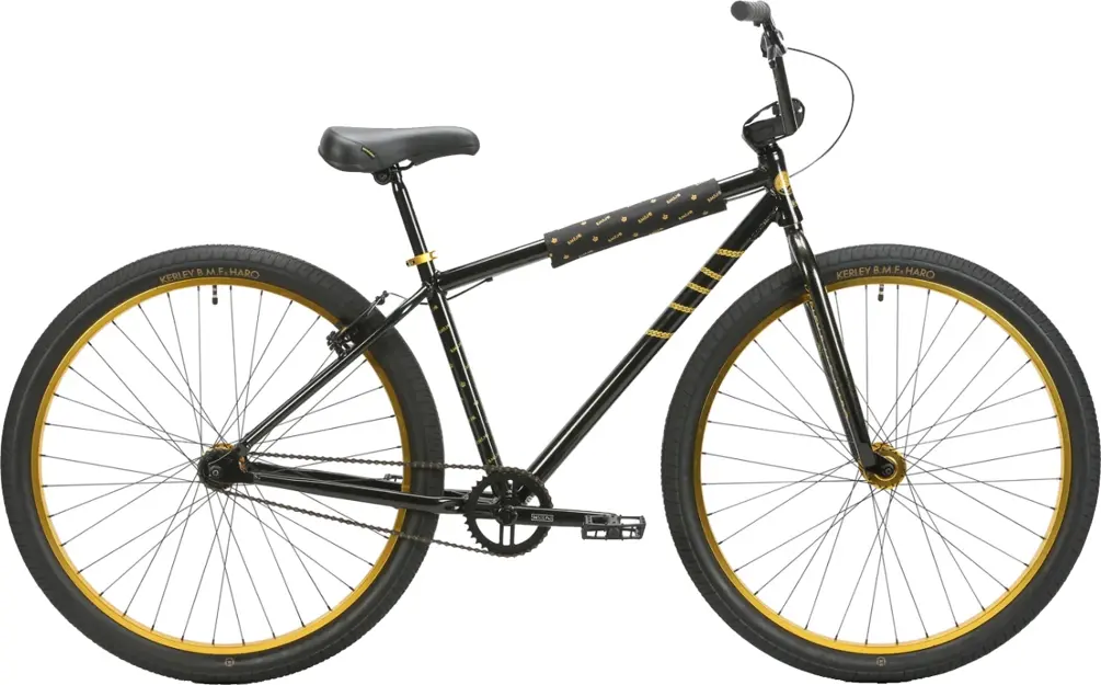 Haro BMF 29’’ BlackThe Haro BMF 29’’ is Chad Kerley’s signature and is all about that Bike Life! Riding around town, throwing wheelies, listening to music and laughing with your friends, that is all CK! We worked with Chad to come up with a bike that he would be hyped on for ride-outs and every day rolling. The B.M.F. is all of that, with luxury-inspired graphics, paint that pops, and fitted with BMX components to hold up to everything Chad (and you) can dish out. The BMX is Chad Kerley, the B.M.F. is Bike Life. The 6061-T6 heat-treated alloy frame, Integrated head tube, Double Wall Rims, mid BB shell, 1 1/8" Threadless full chromoly fork w/internally threaded steerer tube with tapered legs are built to take on your imagination and bring your riding style and tricks to life. The Haro B.M.F. chromoly 4-piece bars, B.M.F railed seat, B.M.F pad set, and Premium CK grips complete the look as you catch the eyes of observers. Available in Black and Pearl White.691840238335