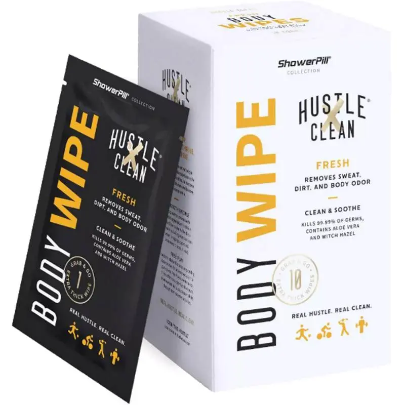 Hustle Clean ShowerPill Body Wipe 10 PackThe Hustle Clean ShowerPill Body Wipe 10 Pack uses the highest quality ingredients and test our products with real athletes, trainers and doctors. Every day, everybody. 10 individually wrapped wipes. Proven to kill 99.99% of germs, while leaving skin feeling clean, fresh, and moisturized with aloe vera, witch hazel, and vitamin E. Not flushable. You know all the nutrients your skin deserves with none of the harmful stuff it doesn't. Yup, these wipes are paraben and sulfate-free. We never ever test on animals!859992003021