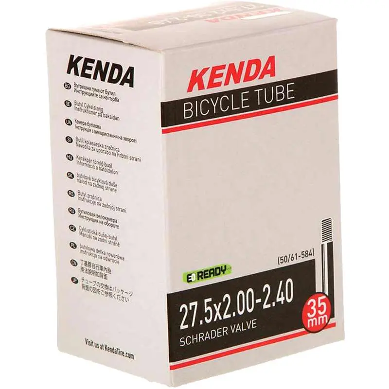 The Kenda 27.5 x 2.0-2.4 Tube is a replacement tube made with 0.85mm thick butyl rubber walls. The Schrader valve measures 35mm long. For 27.5’’ tires between 2.0’’ and 2.4’’.