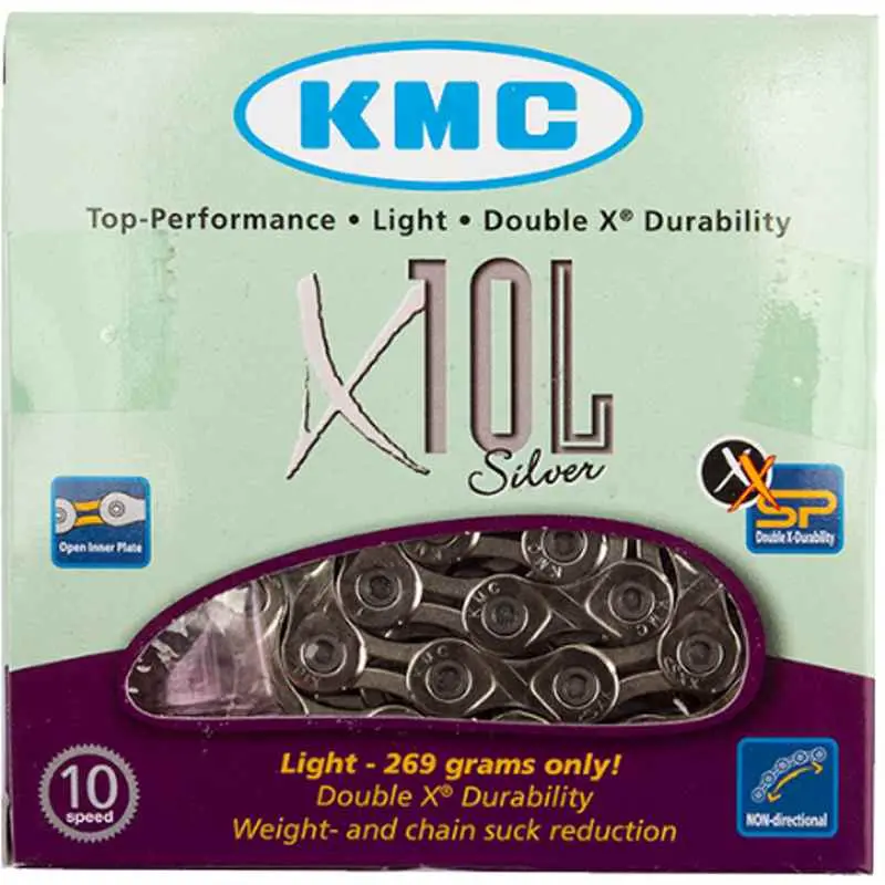 KMC X10L Light Chain 10 Speed SilverThe KMC X10L 10 Speed Light Chain Silver has hollow inner plates for a light weight and inner and outer plate chamfering with a double x bridge design for extra smoother shifting and wonderful durability. Includes a missing link or replacement pins. This model has improved mud shedding when compared to previous KMC chain designs. Compatible with 10 speed setups and has 116 links. Weighs only 286g.766759713225