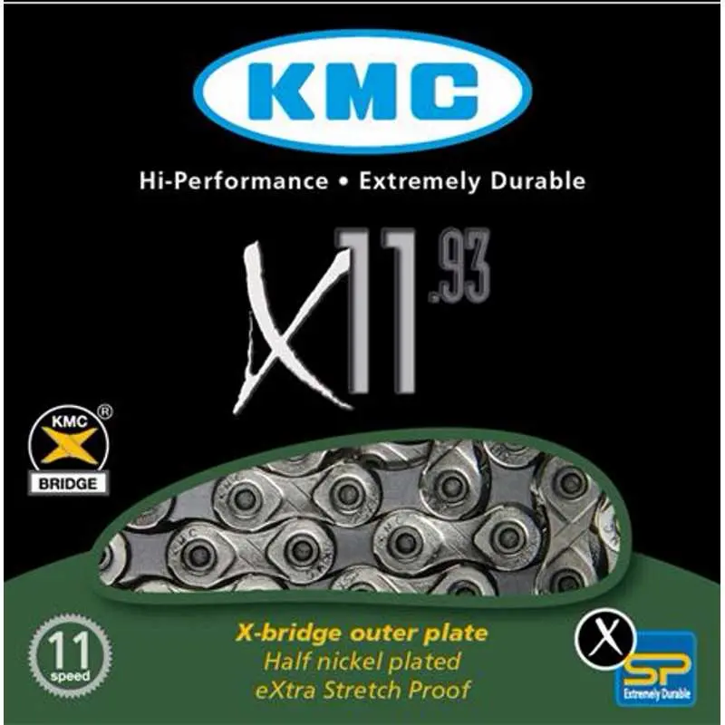 KMC X11.93 11 Speed Bicycle Chain 118 Link Silver/BlackThe KMC X11-93 Bicycle Chain is an 11 speed chain fitted with 118 links and is high performing and extremely durable. The X-Bridge technology is specially designed to enable fast, smooth and precise shifts thanks to the outer plates. Compatible with all 11 speed road and MTB systems.766759711665