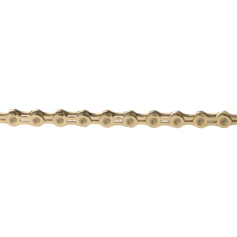 KMC X11EL Ti Nitride Chain 11 Speed 118 Links GoldThe KMC X11EL Ti Nitride Chain is compatible with your 11 speed Shimano, Sram, and Campagnolo setup. The Titanium Nitride gold coating reduces friction. The Double X Bridge shape increases the efficiency of the shifting precision. The mushroomed pin design further increases the longevity of the design. Comes with 118 links and a KMC Missing Link 11 to connect the chain. Weighs 265g. Available in Gold.766759711184