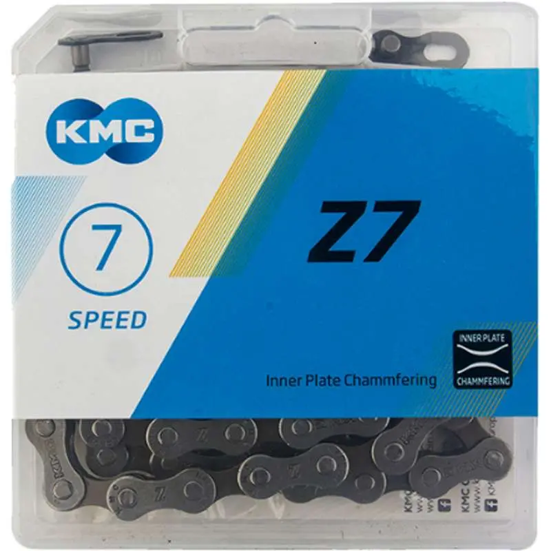 KMC Z7 Index 6/7/8 Speed Chain Grey/Brown 116LThe KMC Z7 is a great replacement chain for 6/7/8 Speed setups. Remember to change your chain ever 1000 miles or so to prevent extra wear on your chainrings. Comes with either missing link or replacement pins. 116 Links, measures 1/2x3/32’’. Weighs 340g.766759950507