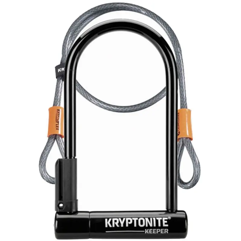 Kryptonite Keeper 12 Standard U-Lock w/ Flex Cable 004370The Kryptonite Keeper 12 Standard U-Lock w/ Flex Cable has a 12mm Hardened Steel Shackle to resist hand tools. There is a reinforced collar over the key way to further resist tampering. The High Security Disc Cylinder’s rugged design has a click style transportation bracket to make it easy to carry. There is a protective vinyl covering to prevent scratches on your frame from the lock.720018004370