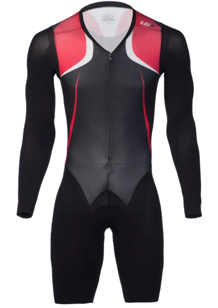 Louis Garneau Elite Course Body Suit X-Large Black/RedElite Course Body Suit by Louis Garneau implements one-piece technology, which offers a minimum number of seams for enhanced aerodynamics and comfort. A flap at the back is integrated to accommodate a race bib and reduce hindrance. A low-cut collar, long sleeves, and a longer leg length are all implemented to increase aerodynamics. The engineered fit was designed in the body position of a cyclist. This type of articulated construction eliminates excess materials and makes this suit completely second-skin-like. Made of Lycra® Pro, the fabric is adapted to the body in a way that offers a smooth surface with no interruptions, bunching, or excess material. Treated with coldblack®, the fabric reflects heat and the fabric stays cool to the touch.775504657233
