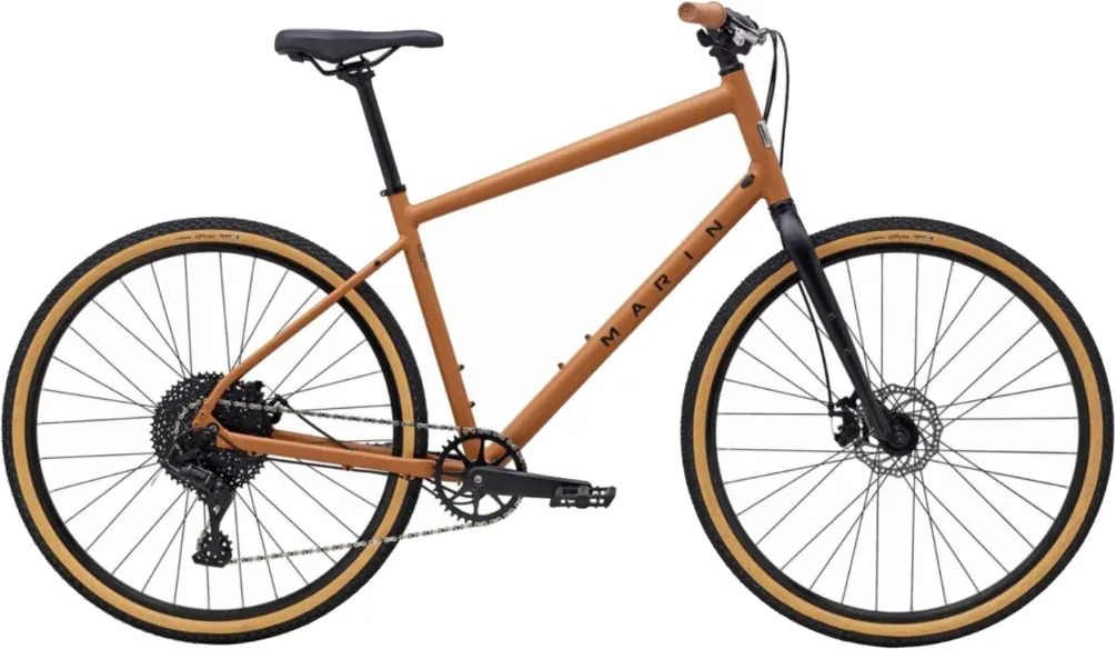 Marin Kentfield 2 Small Tan The Marin Kentfield 2 700c is a retro-modern, stylish, yet affordable bike that can do it all. The Kentfield features a super lightweight Series 1 Aluminum frame with internal cable routing, and mounts for bottles, racks, mudguards, and a kickstand. The Kentfield's GPVee tire is the perfect blend between a fast street tire and knobby tread for cornering off of paved surfaces. The Shimano Mechanical disc brakes give exceptional stopping power when you need it. The wide range 1x drivetrain gives you plenty of gearing options while you are navigating your adventure. 843346108937