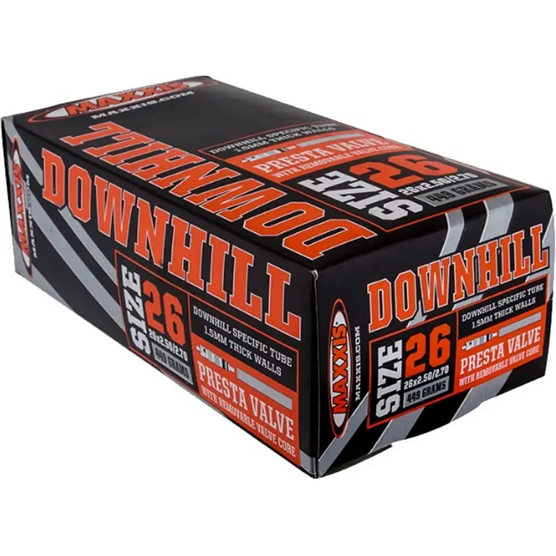 Maxxis DownHill Tube 26x2.50-2.70 Presta Removable CoreMaxxis Downhill Tubes are some of the most reliable and durable tubes in the name of off-road and downhill racing. The 1.5mm thick inner-tube can withstand rugged terrain and as much pressure on the trails as the bike itself.897504