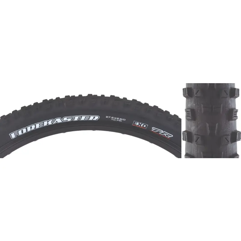 Maxxis Forekaster 27.5x2.6 Tire EXO TubelessThe Maxxis Forekaster 27.5x2.6 Tire is an aggressive XC racing tire engineered for loose and wet conditions. The Dual Compound gives you excellent traction and siped knobs help evacuate water more efficiently. The EXO Sidewall helps to protect your sidewalls from cuts. This 120 TPI tubeless ready is made for rims with 30-35mm inner width. The Max PSI is 40.197142988943