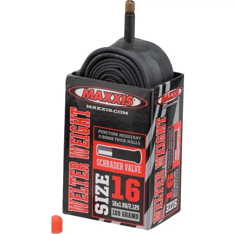 Maxxis Welter Weight 16x1.90-2.125 SchraderMaxxis WelterWeight 16x1.90-2.125 Schrader Valve Tube is a great choice for everything from everyday street riding to jumps and ramp riding. This tube is specifically good for BMX riding, due to its thick 9mm design. It’s a lightweight design that weighs only 200 gram. Made with Butyl rubber.4717784023755