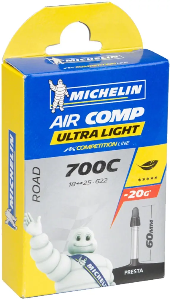 Michelin A1 AirComp Ultra Light 700c 18/23c 60mm Presta Tube Michelin A1 AirComp Ultra Light 700 18/23c Presta Tube. Now anyone can get the advantage of our remarkably light "Service Course™" ultralight butyl tubes. The combination of the Aircomp® Ultra-light tube's extremely lightweight and consistent Michelin quality make these an obvious choice for high performance applications. 086699650108