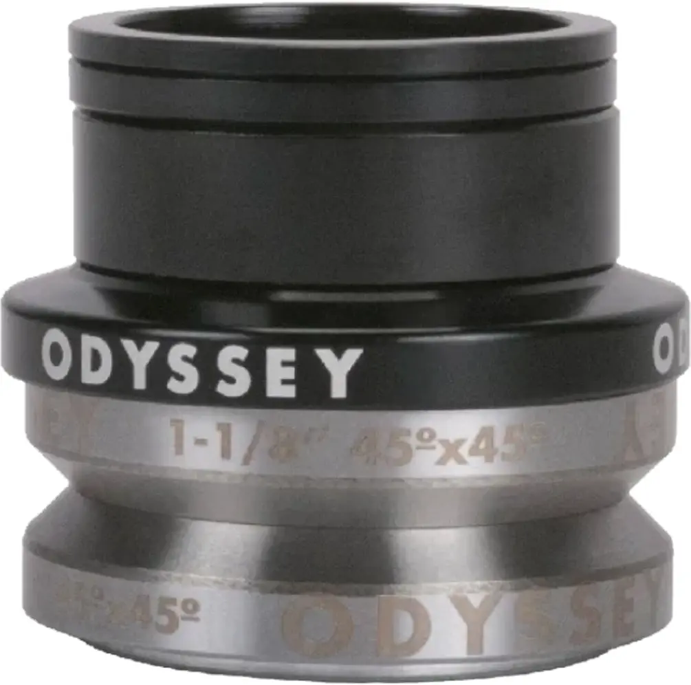 Odyssey Pro Integrated Headset Low Stack Black The Odyssey Pro Integrated Headset features sealed bearings and a precision tapered wedge to keep the headset tight at all times. This is the low stack version and includes color matched spacers of 2mm, 3mm, and 10mm. The bearings are laser etched and 45/45 degrees. Weighs only 62g. Has an outer diameter of 41.8mm and fits on 42mm BMX head tubes. Available in High Polished and Black. 630950124121