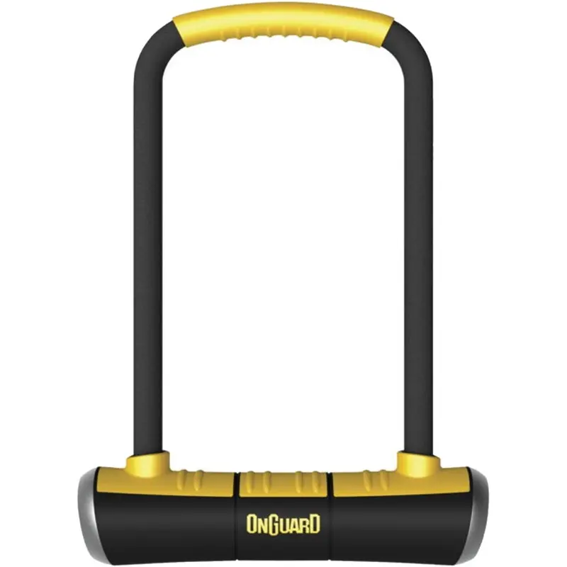 OnGuard Brute LS U-Lock 8000OnGuard Brute LS U-Lock 8000 has nearly the highest security rating using hardened steel for a 95 out of 100! Register your lock with OnGuard for three years of coverage and for free key replacements, see OnGuardLock.com for details. The Quattro Bolt Locking Mechanism provides unequaled strength by locking the cross bar to the shackle on four sides maximizing pull resistance. The new user friendly, pick, pull, and drill resistant OnGuard M-key Cylinder offers optimum deterrent against physical attack. Comes with 4 keys and 1 Microlight key for use after dark. The dimensions are 260mmx115mmx16.8mm. Comes with frame holder.768661280000