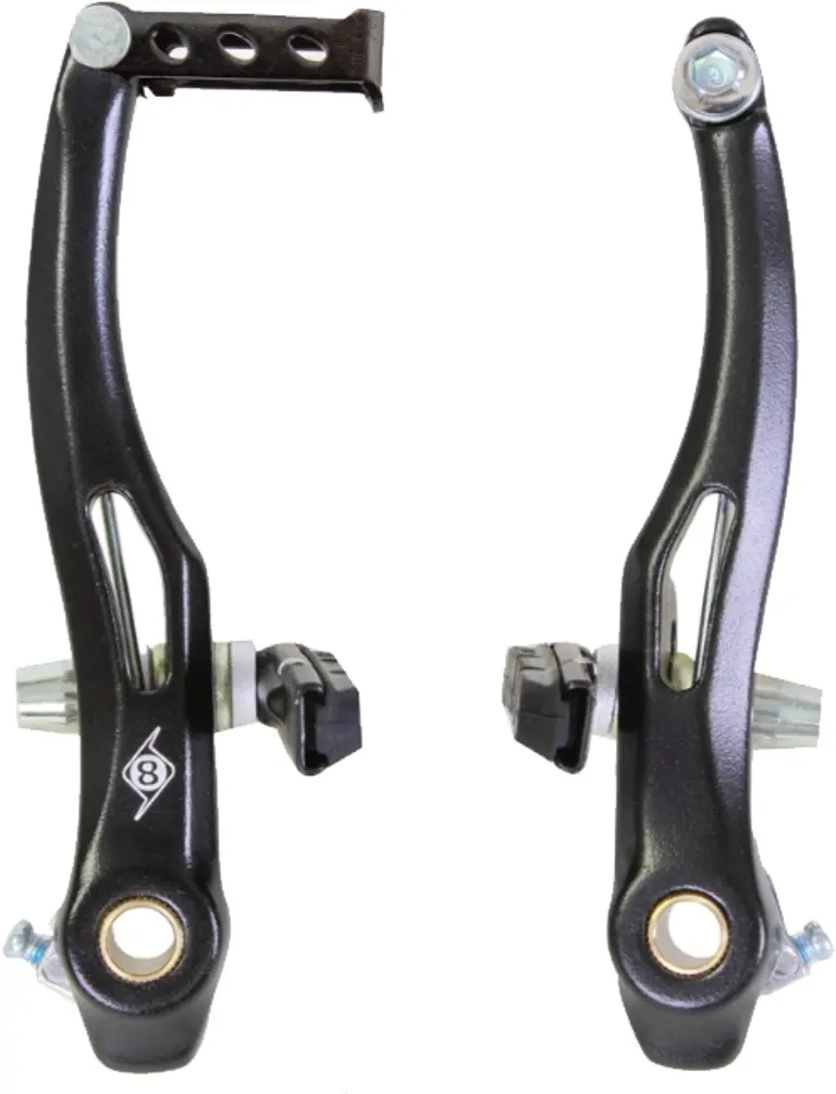 The Origin8 V-Brake Caliper features Forged Alloy construction, a 110mm length to clear fenders, Linear Tension Spring and a Cartridge brake pad design. Laser etched Logo.