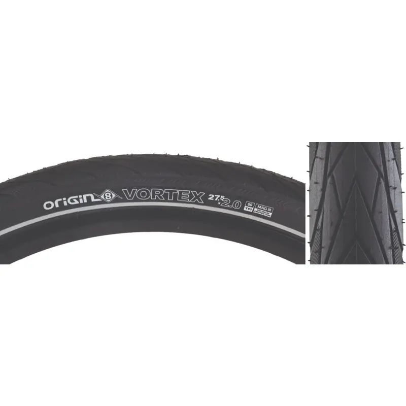 Origin8 Vortex 27.5 X 2.0 Wire Black TireOrigin8 Vortex 27.5 X 2.0 Wire Black Tire is the tire for your all-purpose needs. With smooth water evacuating grooves, the tire provides unrivaled grip in wet road conditions. Raised, textured shoulder blocks help for better traction over loose debris. Reflective sidewall help keep you seen day or night and a 60 x 60 TPI Nylon layer provide maximum puncture protection.888571023648