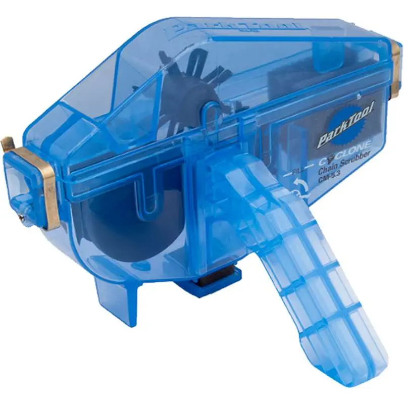 Park Tool CM-5.3 Cyclone Chain CleanerThe Park Tool CM-5.3 Cyclone Chain Cleaner has been Updated to allow for the scrubber handle to be used on either side. Certain E-Bikes do not allow backwards pedaling when being cleaned. There is an extra-large solvent reservoir for extra cleaning capacity. There is a series of roller brushes thoroughly scrub chain clean. The magnet in the base traps metal particles. The sponge dries chain upon exit and helps to reduces mess. The molded handle in casing eases utility.763477001948
