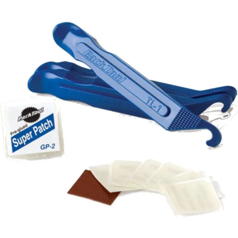 Park's popular GP-2 Super Patch Kit and TL-1 Tire Levers packaged together as a kit. Three Tire Levers and a box with six patches and one piece of sandpaper on a blister card.