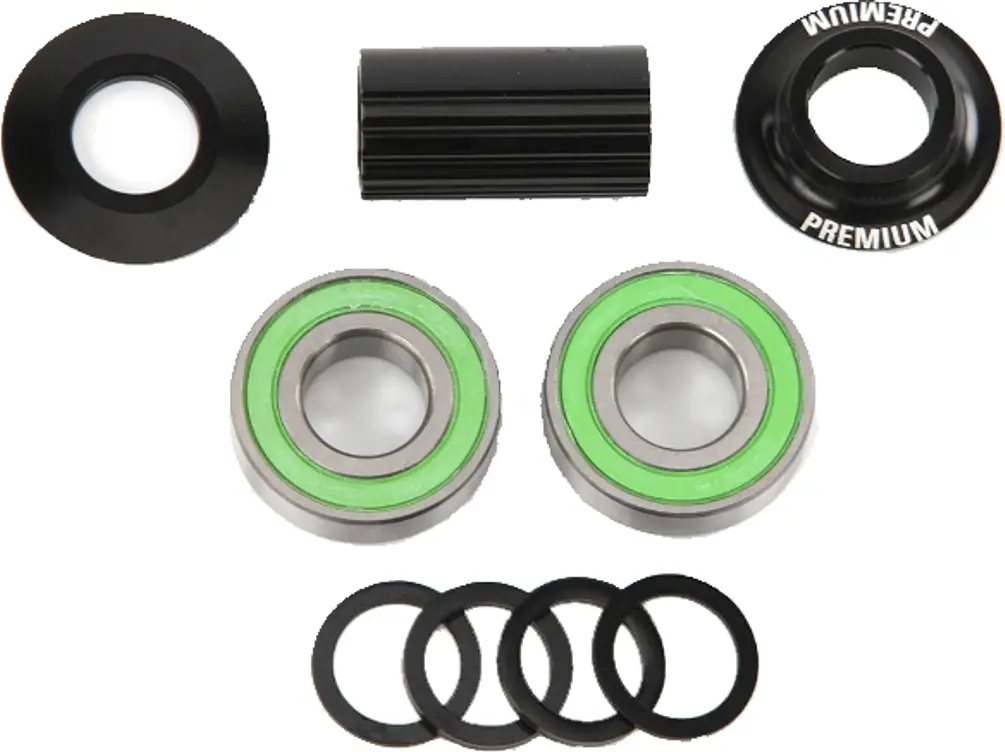 Premium Bottom Bracket 19mm Green Premium Bottom Bracket fits Haro Lineage, Profile Race, Redline Flight and all other cranks that use a 19mm/22mm spindle with a mid bottom bracket. Contains 2 x sealed bearings, 1 x spacer tube, 2 x flush bearing cones and Aluminum spacers in various thicknesses. Available in 19mm and 22mm. 691840766609