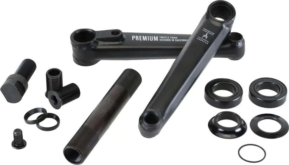 Premium Trestle Crank 165mm BlackThe Premium Trestle Cranks are stiff, strong and built to last. They use a post-weld heat-treated chromoly construction with a hollow 24mm spindle. The arm/boss shape is equal parts ankle-friendly and catch-free for grind variations. Set includes a sealed bottom bracket set, removal tool and a lifetime warranty. Weighs 2lbs 0.6oz. Available in 165mm, 170mm, and 175mm.691840766333
