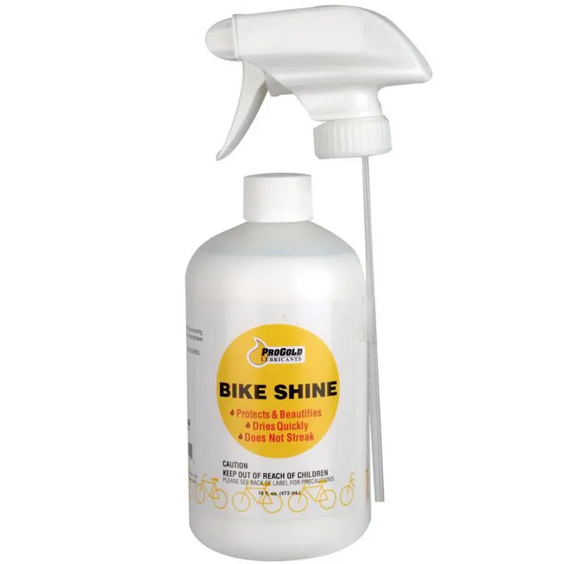 ProGold Bike Shine 16oz Trigger SprayProGold Bike Shine restores your bicycle to that like-new shine. Bike Shine also protects against the sun's rays that can dull and fade your bike frame over time. Safe for all surfaces on your bicycle. Bike Shine also leaves a residual coating that aids in repelling dust and dirt. Bring out the shine of your bicycle with Bike Shine!711808207194