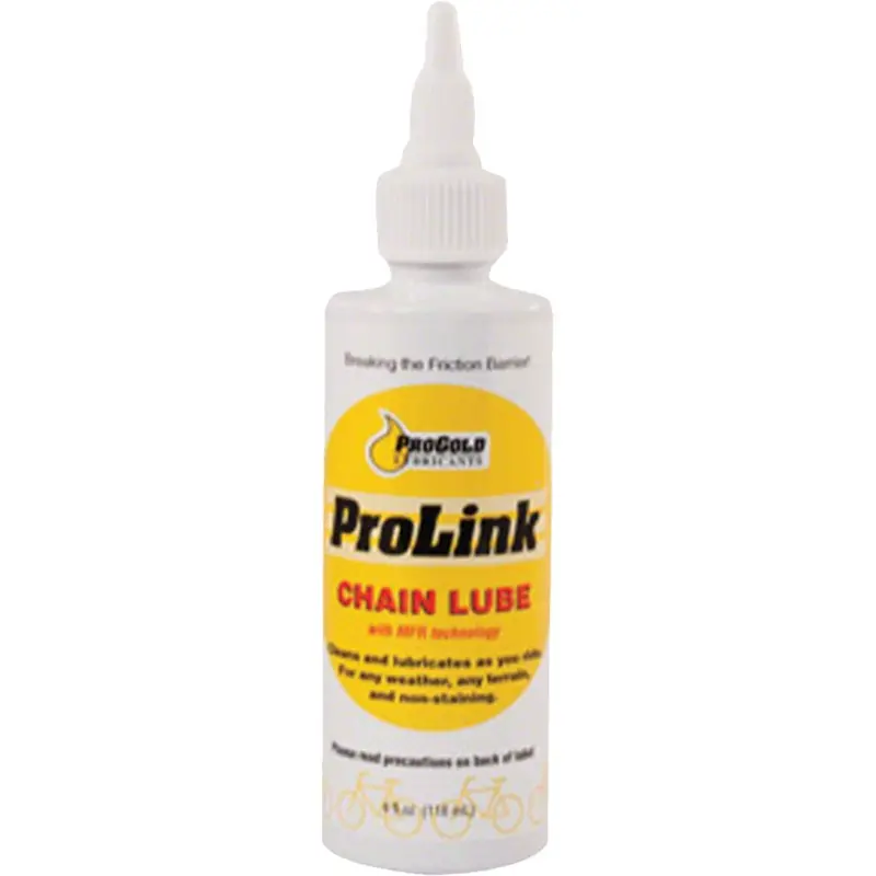 ProGold ProLink Chain Lube 4oz Drip Progold ProLink Chain Lube is a thin-bodied lubricant which utilizes metal friction reducer technology for smooth shifting and a quiet drive train. Does not build up or become tacky; sheds dirt, mud, and abrasives. Also repels moisture and prevents corrosion. 787769110156