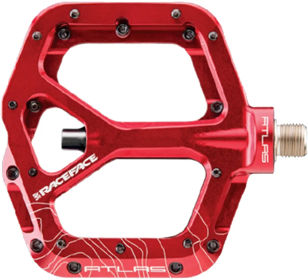 Race Face Atlas Pedal 9/16 Red The Race Face Atlas Pedals have a low profile T6061-T6 aluminum body with a double concave platform. This wonderful shape gives your feet traction as you weave your way in and out of nature’s laden paths. The chromoly axle and svelte design go great together while you explore the wilderness or your favorite trail. There are 20 bottom loading hex traction pins to further your traction and control of the pedals. There are 4 sealed cartridge bearings per pedal. The platform size is 101 mm x 114 mm. Approximate weight: 355 grams. Available in Black, Red, Blue, Green, Orange, and Purple. 895428014742