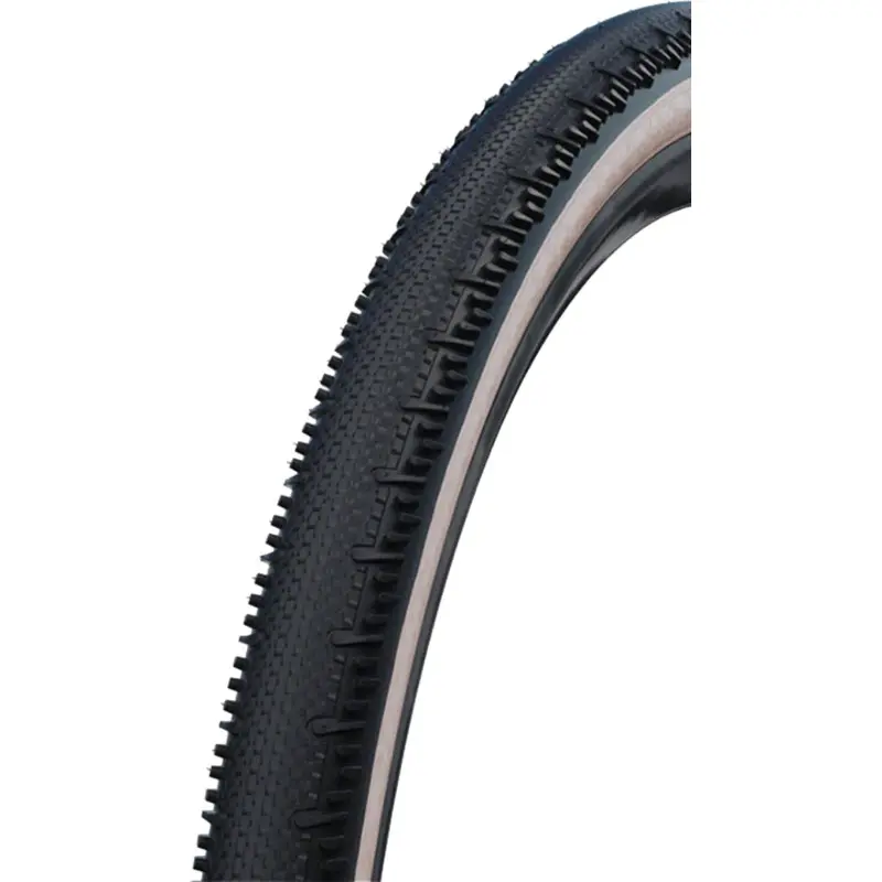 Schwalbe G-One RS Pro 700x50 Tire Fold Tubeless Evo V-Guard Addix Race Black/TransparentThe Schwalbe G-One RS Pro Tire is a high-performance gravel tire tailored for racing and fast-paced rides on mixed terrain. It features a refined tread pattern designed to optimize speed and control, with tightly spaced central knobs for low rolling resistance on hard surfaces. The G-One RS showcases the Addix Race compound for the lowest rolling resistance in the G-One range. Best performs on light terrain, hard surfaces and asphalt. There are braking and traction edges for front wheel and rear wheel thanks to scale-like tread pattern. Souplesse construction for smooth ride with the addition of high puncture protection under tough racing conditions. The Addix Race Compound increases grip at high cornering speeds and boosts the durability. Tubeless Ready Easy, or TLE, makes mounting quick and consistent, while reinforcing the sidewall from cuts. The V-Guard is extremely lightweight and cut resistant with high-tech fabric. Available in 700x50C. Weighs 585g. The casing has 67 EPI and has a folding bead. Available in Black/Transparent.4026495945844