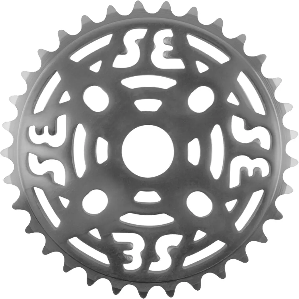 SE Bikes One Piece Alloy Chainring 33T Silver The SE Bikes One Piece Alloy Chainring combines the SE logo with a throwing star design in a bunch of eye-catching colors. These CNC machined chainrings are made of Alloy and work with standard 1/2" x 1/8" chains on cranks that have a 19mm spindle. These have 33T on them and are available in Silver, Anodized Red, Gold, Anodized Blue, and Painted Blue. 888571061114